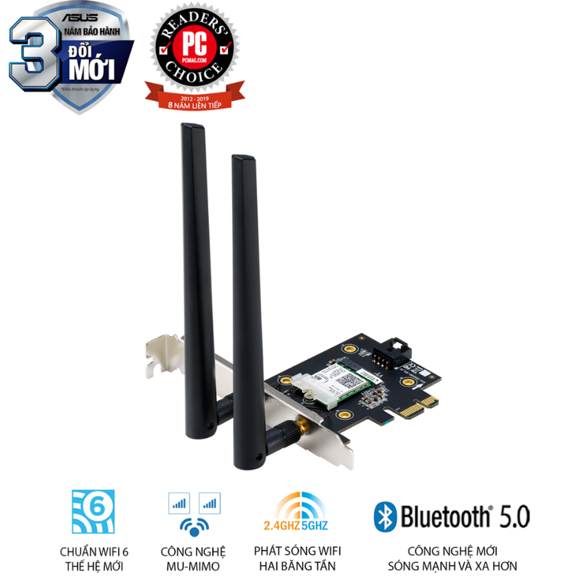 Sở hữu công nghệ hiện đại như OFDMA, MU-MIMO, Beamforming, và Bảo mật WPA3, ASUS PCE-AX3000 là giải pháp nâng cấp mạng lý tưởng cho PC gaming, workstation đồ họa chuyên sâu hay văn phòng cao cấp.