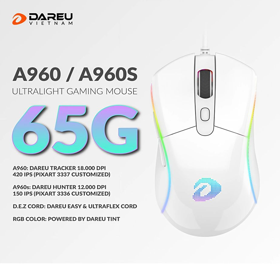DareU A960S White là mẫu chuột gaming đáng giá trong phân khúc, sở hữu thiết kế siêu nhẹ, cảm biến mạnh mẽ, switch bền bỉ và dây cáp tối ưu. Sản phẩm phù hợp với game thủ FPS, MOBA yêu thích sự linh hoạt và tốc độ. Nếu bạn đang tìm kiếm một mẫu chuột chơi game có hiệu suất cao với mức giá hợp lý, A960S White là lựa chọn không thể bỏ qua.