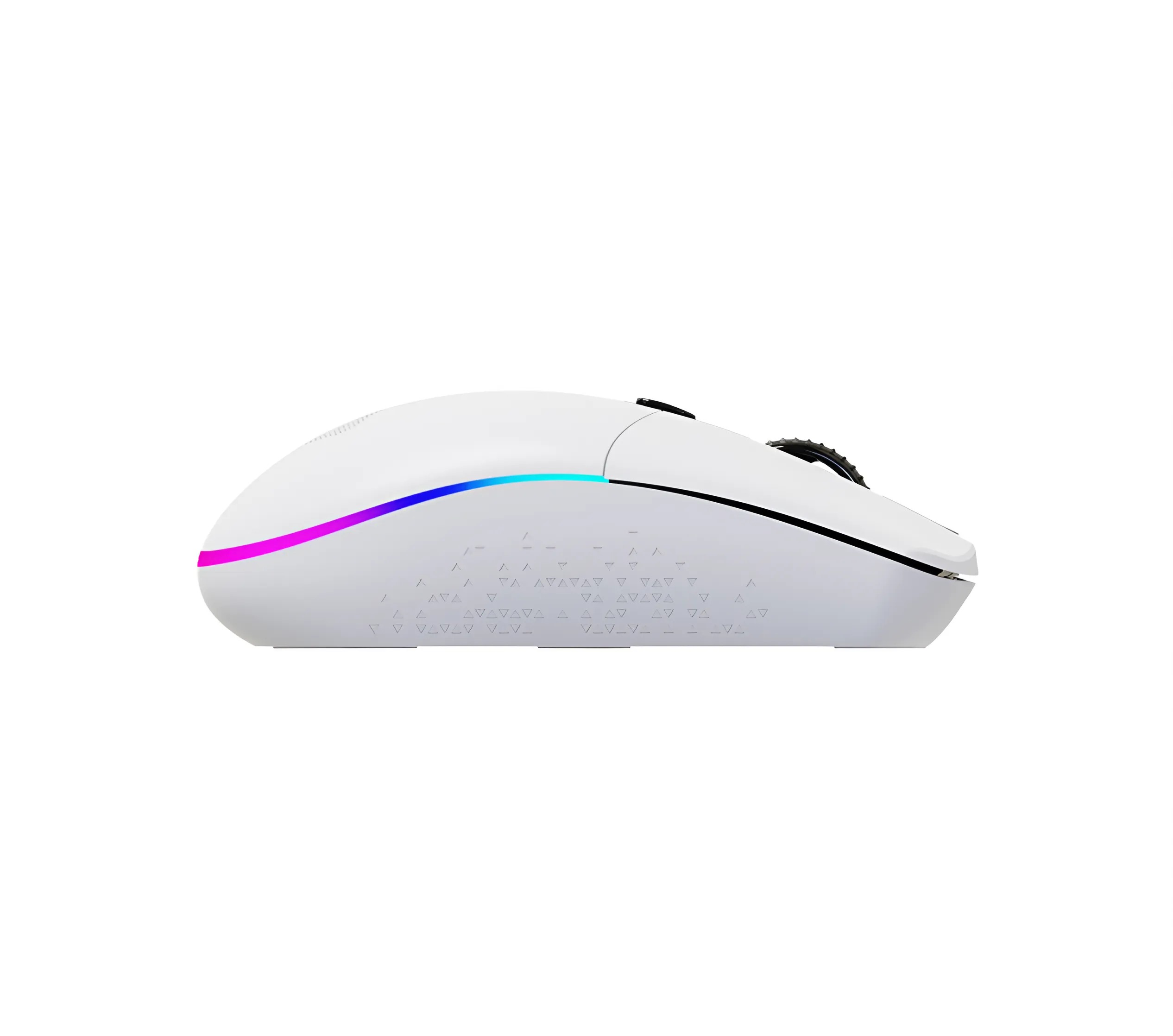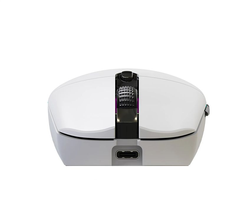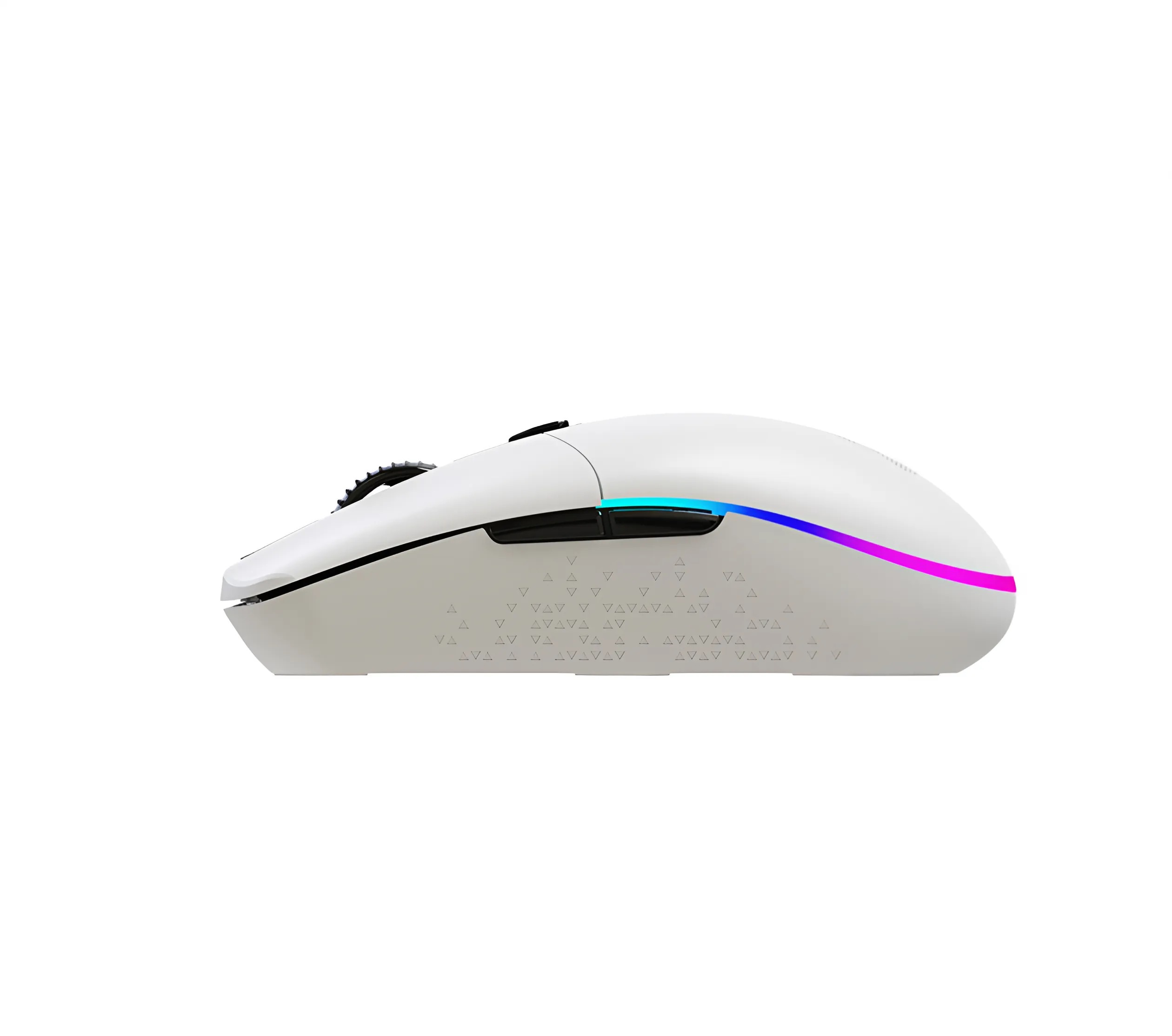 Bề mặt chuột được phủ lớp nhám mờ, giúp chống trượt tay, tạo cảm giác cầm nắm chắc chắn ngay cả khi sử dụng lâu. Tông màu trắng tinh tế, kết hợp với hệ thống LED RGB tạo điểm nhấn nổi bật cho góc setup.