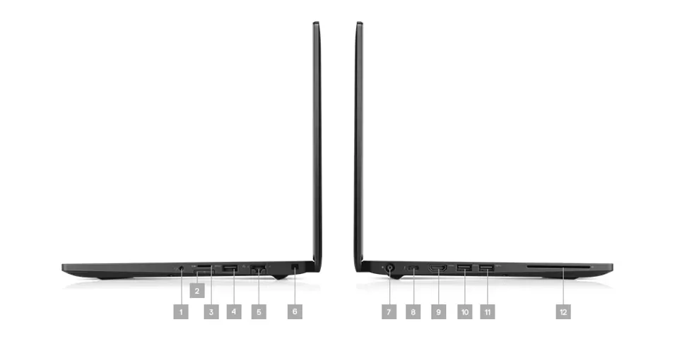 1. Audio Combo Jack | 2. uSD | 3. uSIM | 4. USB 3.1 Gen 1 | 5. RJ45 | 6. Noble Wedge Lock Slot | 7. AC Power | 8. USB Type-C Port | 9. HDMI | 10. USB 3.1 Gen 1| 11. USB 3.1 Gen 1| 12. Smart Card reader
