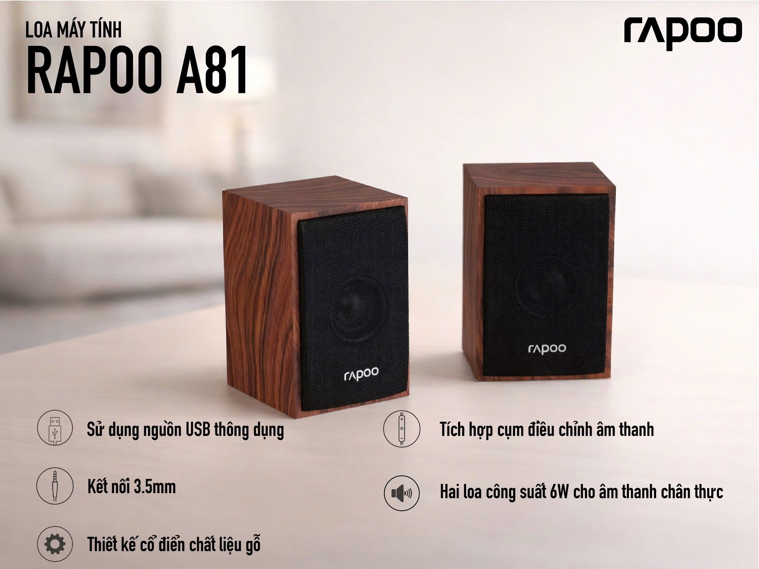 Loa máy tính Rapoo A81 là dòng loa 2.0 nhỏ gọn được thiết kế dành cho người dùng văn phòng, học tập và giải trí tại gia. Sản phẩm đến từ thương hiệu thiết bị ngoại vi nổi tiếng Rapoo, nổi bật với thiết kế vân gỗ sang trọng, khả năng kết nối đơn giản và chất lượng âm thanh ổn định.