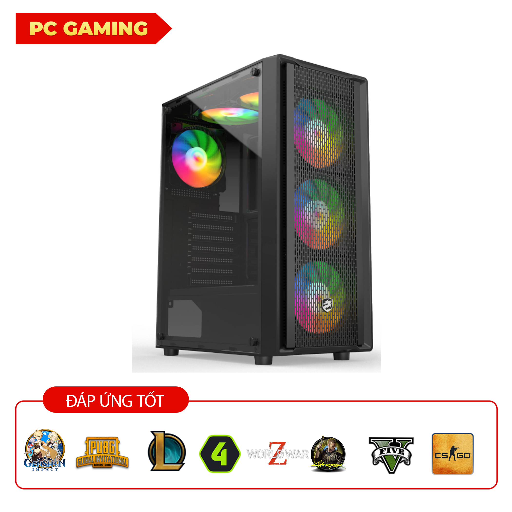 - Thiết kế gaming đẹp mắt – Vỏ case hiện đại, LED RGB rực rỡ, tạo không gian gaming chuyên nghiệp.