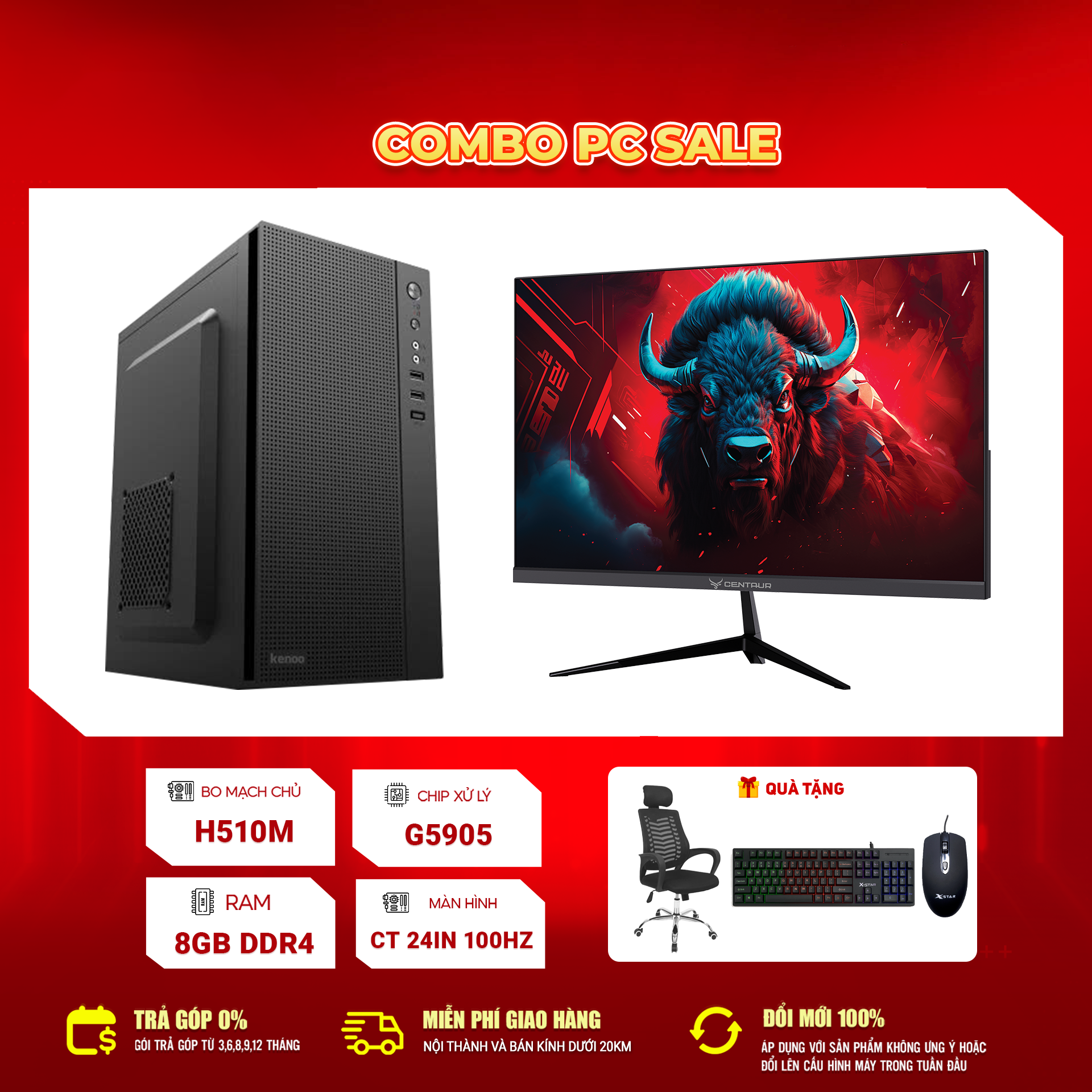 • Màn hình: Centaur 24 inch – Tần số quét 100Hz cho trải nghiệm hình ảnh mượt mà, góc nhìn rộng, giảm mỏi mắt khi làm việc lâu.