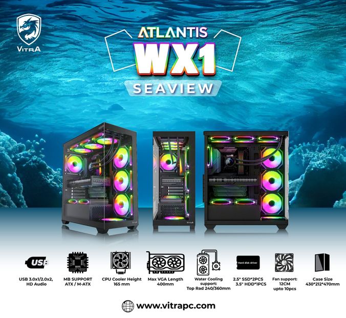 Vitra Atlantis WX1 Black (ATX/Seaview) không chỉ là một chiếc case PC, mà còn là tác phẩm trưng bày linh kiện. Với thiết kế “bể cá vô cực”, không gian lắp đặt rộng rãi và khả năng hỗ trợ tản nhiệt mạnh mẽ, đây là lựa chọn lý tưởng cho game thủ và người dùng đam mê build PC hiệu năng cao.